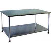 Bằng inox 304 dày 1.0mm, 1 tầng mặt và 1 tầng song- Dưới mặt bàn có xương hộp 100mm bằng inox tấm dày 1.0mm chịu lực- Mặt tầng dưới song inox dày 1.0mm tròn 12.7- Khoảng cách giữa các song 80 mm- 6 chân trụ inox 38x38 mm dày 1mm- Dưới chân trụ có đế cao su.